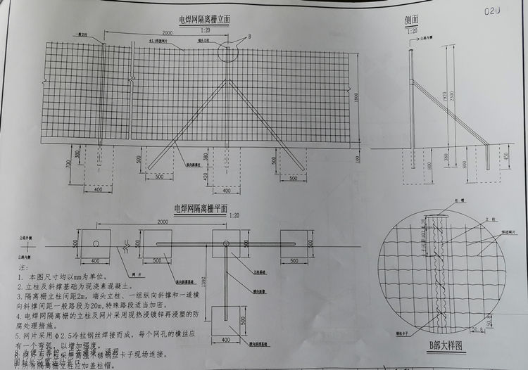 3、電焊網(wǎng)隔離柵立柱間距2m,端頭立柱、一組縱向斜撐和一道橫向斜撐間距一般路段為20m,特殊路段適當加密。