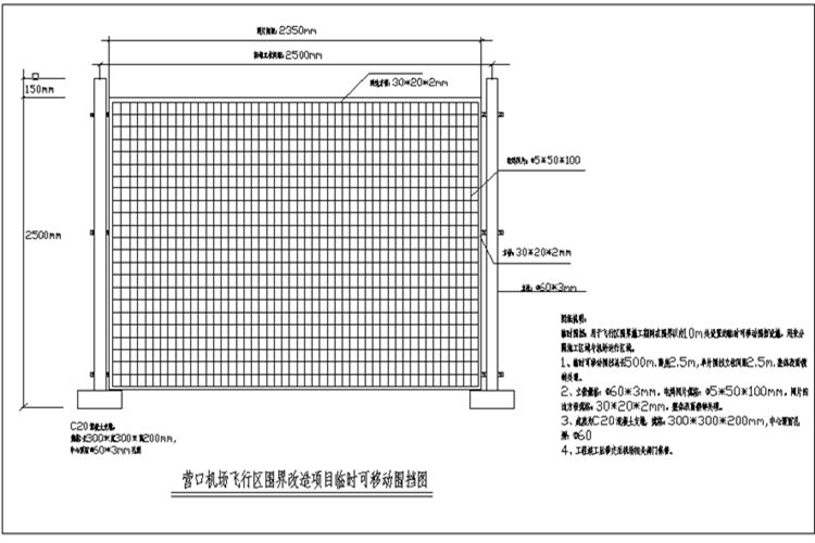3、飛機場項目工地臨時可移動圍擋立柱規(guī)格Φ60*3.0mm,網(wǎng)片規(guī)格50*100*5mm,網(wǎng)片四周方管規(guī)格20*30*2mm,整體表面鍍鋅處理。