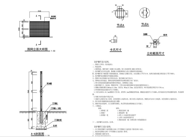 三、防護(hù)柵欄定位詳見總圖,基礎(chǔ)施工時遇特殊情況與設(shè)計(jì)及勘探單位聯(lián)系確定。
