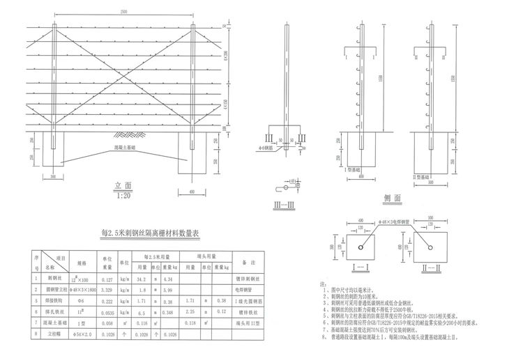刺鋼絲網(wǎng)隔離柵采用圓鋼管立柱。刺絲采用12號(hào)低碳鋼絲或低合金鋼絲制作,應(yīng)符合《一般用途低碳鋼絲》(CB343)。《一般用途熱鍍鋅低碳鋼絲》的規(guī)定。刺鋼絲網(wǎng)隔離柵立柱、斜撐、門(mén)柱采用先鍍鋅后浸塑方式,鍍鋅量不得低于275g/㎡,緊固件、連接件為120g/㎡, 涂塑層厚度應(yīng)大于0.25mm.具體參見(jiàn)《公路交通工程鋼構(gòu)件防腐蝕技術(shù)條件》(GB/T 18226-2015)。