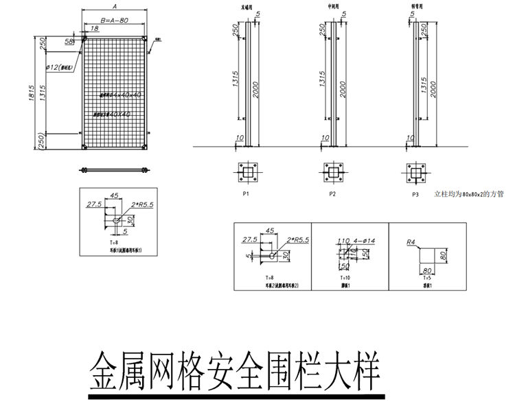 1.安全圍欄立柱均為80x80x2,網(wǎng)框40厚,圍欄網(wǎng)鐵絲直徑4mm,網(wǎng)格大小40x40,安全圍欄立柱底板尺寸200x200x10m,立柱間距1500mm,不足之處按現(xiàn)場實(shí)際情況調(diào)整。