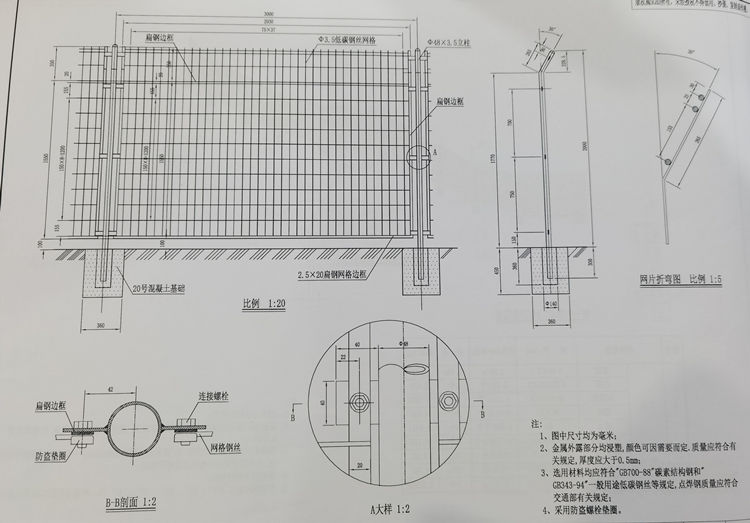 混凝土立柱用混凝土標(biāo)號不低于C20,拌制混凝土所使用的各項材料及混凝土的配合比、拌制、澆筑、養(yǎng)護應(yīng)滿足有關(guān)標(biāo)準(zhǔn)的規(guī)定。電焊網(wǎng)的立柱、斜撐采用有縫焊接鋼管,其公稱尺寸為Φ48X3.5mm,斜撐采用角鋼。刺鋼絲隔離柵的立柱與電焊網(wǎng)(包括網(wǎng)片與立柱等)均為綠色,其具體顏色須經(jīng)業(yè)主確認(rèn)后方