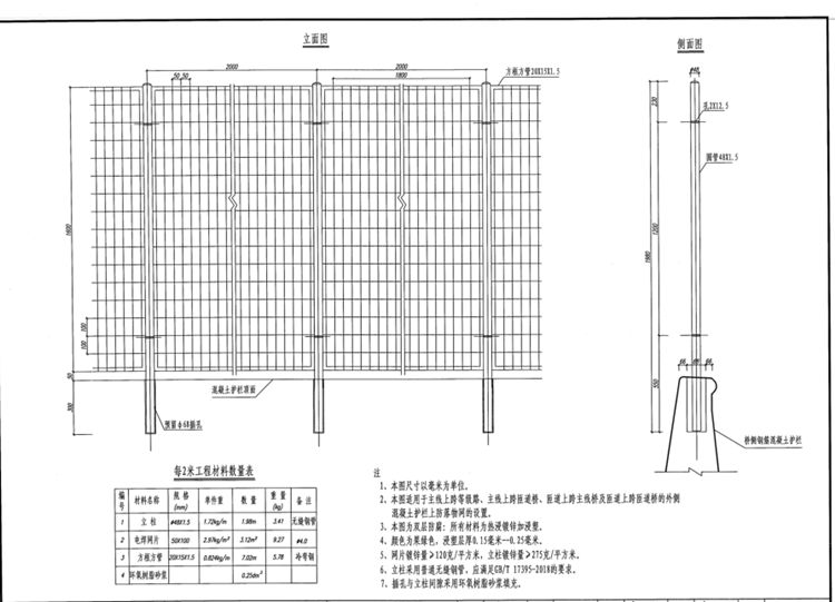 2、本圖適用于主線上跨等級(jí)路、主線上跨匝道橋、匝道上跨主線橋及匝道上跨匝道橋的外側(cè)混凝土護(hù)欄上防落物網(wǎng)的設(shè)置。