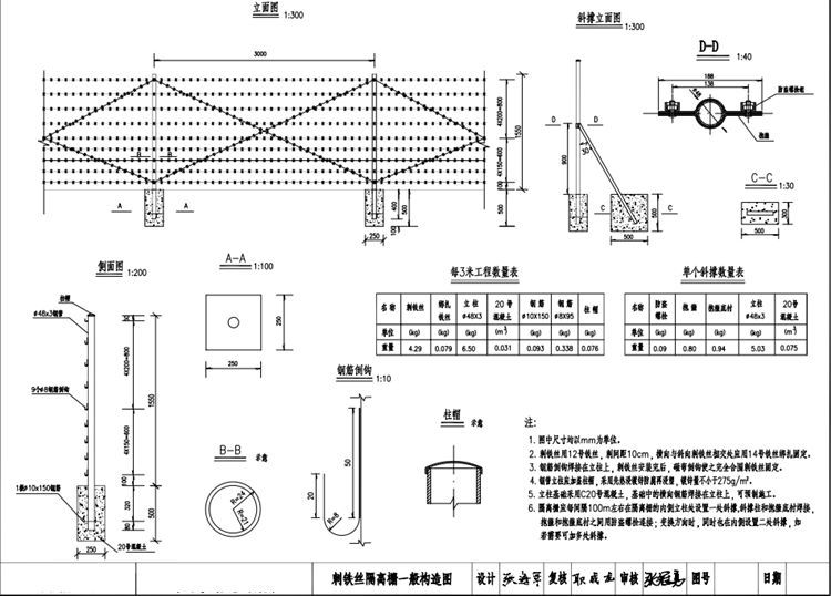 5.刺鐵絲隔離柵立柱基礎采用現(xiàn)澆C20混凝土,基礎中的橫向鋼筋焊接在立柱上,可預制施工。