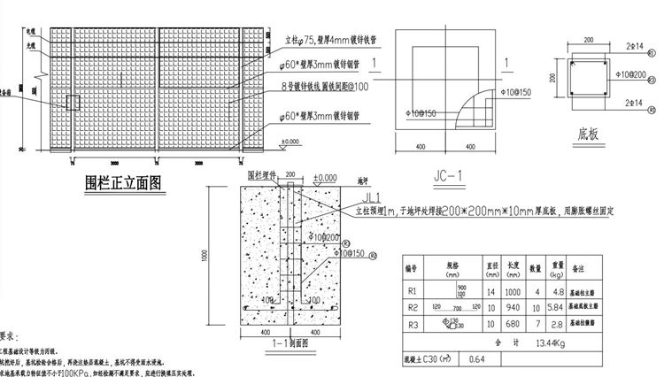 2、熱鍍鋅圍欄的鋼管立柱基坑尺寸:800*800*1000mm (長*寬*深) ;基礎(chǔ)底部夯實(shí),C15混凝土墊層; 現(xiàn)澆混凝土標(biāo)號: C30砼混凝土澆筑,基礎(chǔ)四周回填素土分層夯實(shí)。