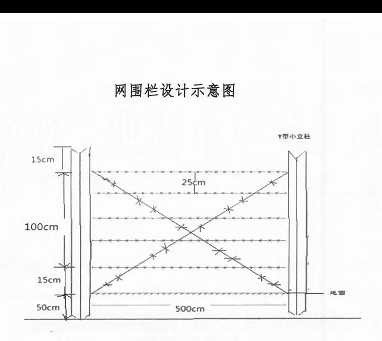 2、鍍鋅刺絲圍欄使用七道刺絲(刺絲規(guī)格為帶刺雙絲合一,鍍鋅鐵絲,單絲2.4mm,雙絲4.8mm),其中五道橫絲,兩道X絲。刺間距小于6cm。 (見鍍鋅刺絲圍欄設(shè)計示意圖)