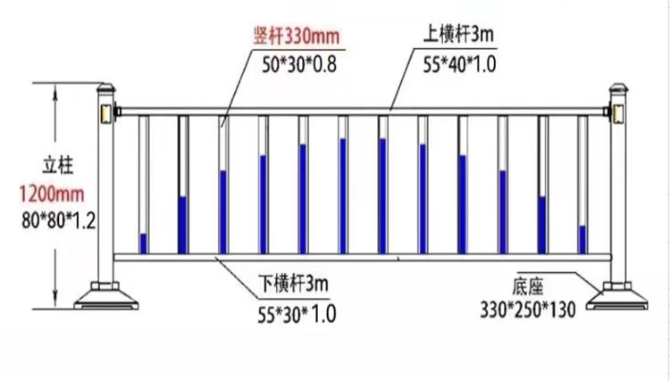 3.鋅鋼護(hù)欄橫桿接口,圓弧形設(shè)計(jì)管件,使管件與接口銜接流暢穩(wěn)固、便于安裝,方管材質(zhì)為鋅鋼(即鍍鋅鋼管),立柱80*80-1.2,橫桿55*40-1.0,豎桿50*30-0.8,底座為鑄鐵,鑄鐵重量不低于20公斤,底座設(shè)有地面安裝固定孔口。