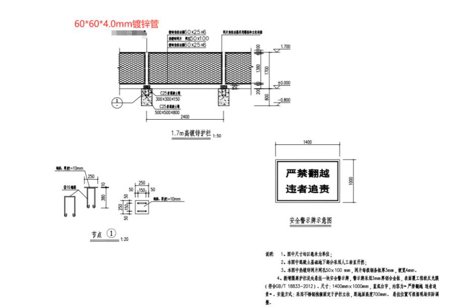 4、新增隔離護(hù)欄處懸掛一塊安全警示牌,警示牌采用3mm厚鋁合金板,表面覆工程級反光膜(符合GB/T 18833-2012)。尺寸:1400mmx1000mm,藍(lán)底白字,內(nèi)容為“ 嚴(yán)禁翻越 違者追責(zé)”。安裝方式:采用不銹鋼抱箍固定于護(hù)欄立柱,距地面高度700mm, 懸掛位置可根據(jù)現(xiàn)場實際調(diào)整。