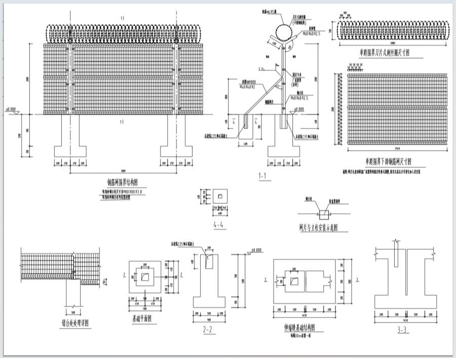 總高度2.5m。立柱截面尺寸為口60x60x2.5mm、延伸臂截面尺寸為口60x60x2.5mm。轉(zhuǎn)角處立柱截面尺寸為口80x80x3.0mm,斜撐截面尺寸為口48x48x2.0mm@9000。鋼筋網(wǎng)片網(wǎng)格尺寸為50x100mm(中到中),滾籠采用刀片式刺絲(不銹鋼材質(zhì)),直徑為500mm。不用考慮基礎(chǔ)。立柱間距3米,轉(zhuǎn)角暫按15處考慮鋼筋網(wǎng)圍界的網(wǎng)片、立柱及延伸臂的防腐處理采用金屬保護(hù)層結(jié)合涂塑保護(hù)層的復(fù)合保護(hù)。金屬保護(hù)層采用熱鍍鋅,鍍層厚度:網(wǎng)片及連接件部分不小于120g/㎡。立柱及延伸臂部分不小于270g/㎡。涂塑層采用高附著力聚酯涂層,涂層厚度≥80um(干膜),涂塑工藝由內(nèi)及外為富鋅磷化、有機(jī)環(huán)氧涂層、熱固性聚酯粉末涂層。