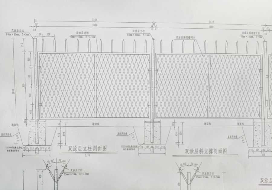 2、雙涂層隔離柵Gw-3.0-55: (網(wǎng)片采用鋼片網(wǎng),網(wǎng)片規(guī)格3mx1.8m,厚度3.0m,網(wǎng)孔尺寸55mmx150mm(菱形對角尺寸),邊框及豎桿方管40mmx40mmx1.5mm,配件包括:防雨帽、連接卡及防盜螺栓等):方管立柱采用80mmx80mm,壁厚3.0m,單根立柱長2.8m,間距3m,立柱與網(wǎng)片的連接方式為焊接。立柱基礎(chǔ)C25F200(高性能抗腐蝕砼)現(xiàn)澆混凝土基礎(chǔ),規(guī)格尺寸:0.45x0.45x0.6m(長x寬x高)。