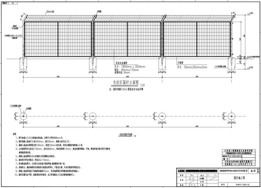 2、圍欄混凝土基礎(chǔ)尺寸為φ300mm,高500mm,混凝土標(biāo)號(hào)為C30。