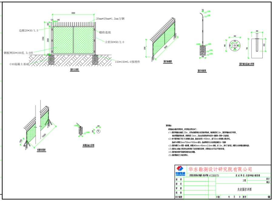 (1)圍欄端高出地面2.35m,主要由熱鍍鋅鋼立柱及鋼絲網(wǎng)構(gòu)成,鋼柱跨度約3.0米,圍欄頂端向站區(qū)外彎折,鋼絲網(wǎng)需做浸塑處理,浸塑厚度1.5mm,其余未作說(shuō)明材料均采用“熱鍍鋅+ 浸塑”方法防腐。