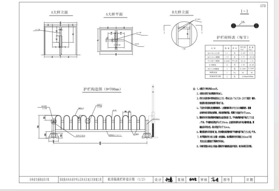 8、車輛行駛指示標(biāo)志立柱插入隔離欄桿端鑄鐵基座中固定,相關(guān)結(jié)構(gòu)另見詳圖。
